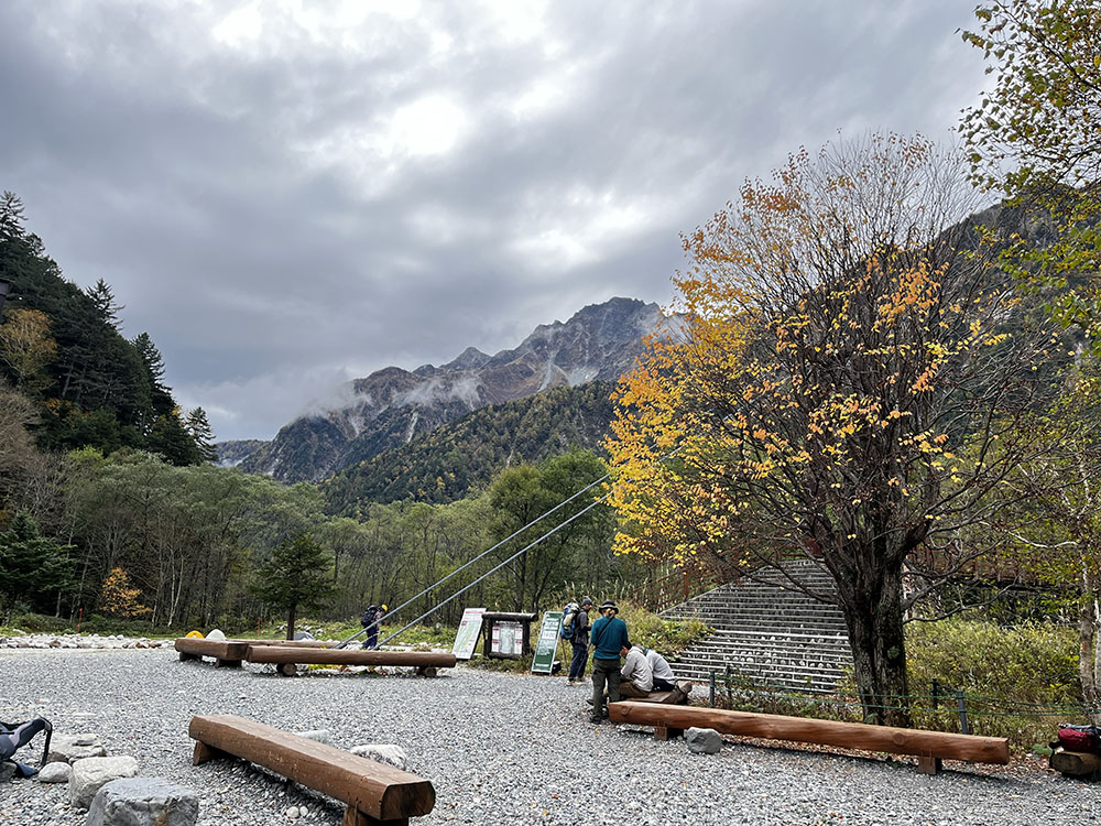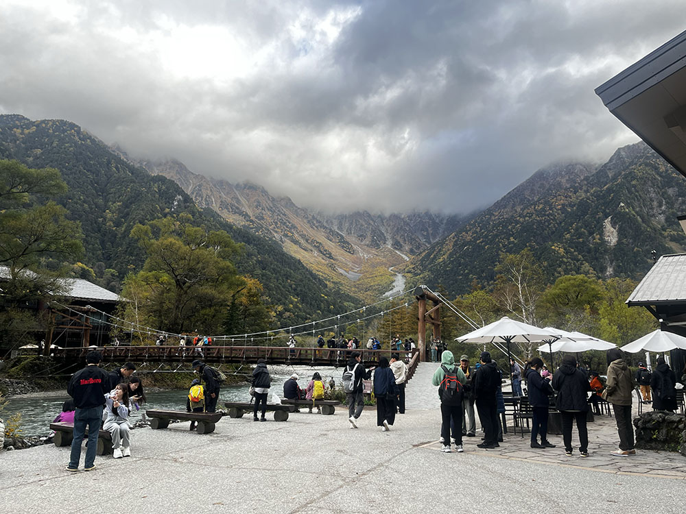バスを降りて数分、河童橋に立った。橋の上は観光客でごった返している。見上げる穂高連峰の峰々は厚い雲に覆われており、その全貌を見ることはできない。