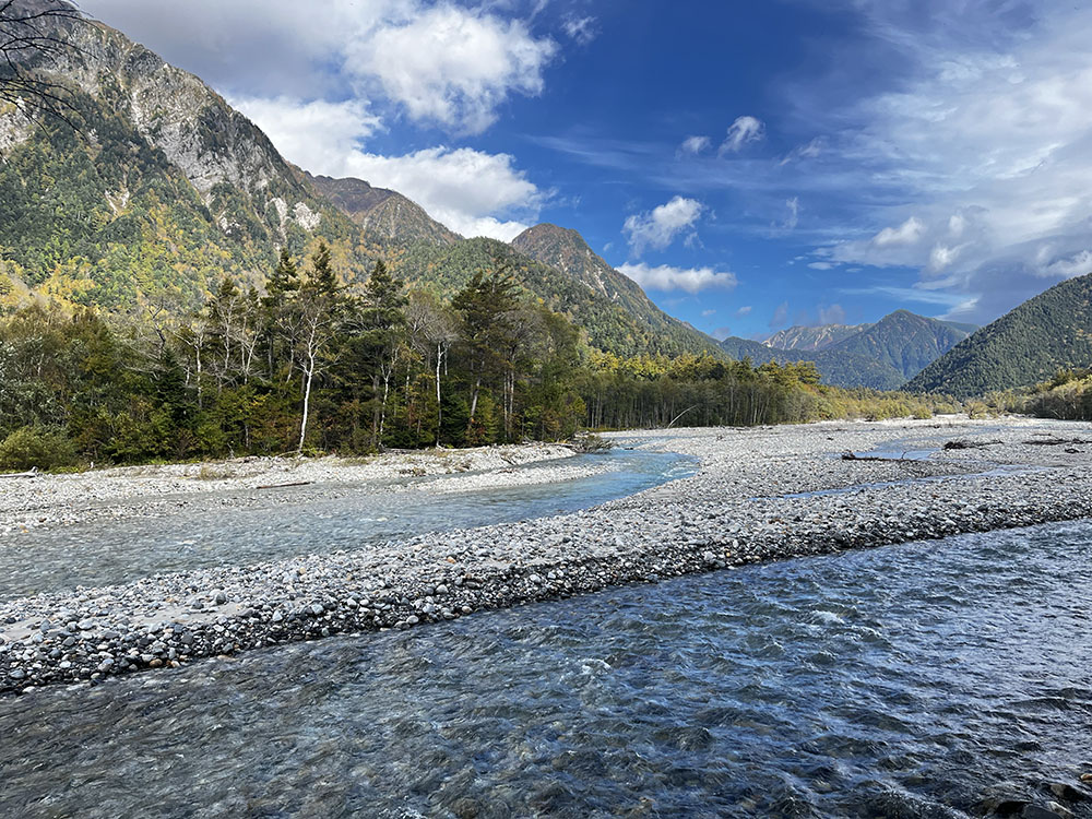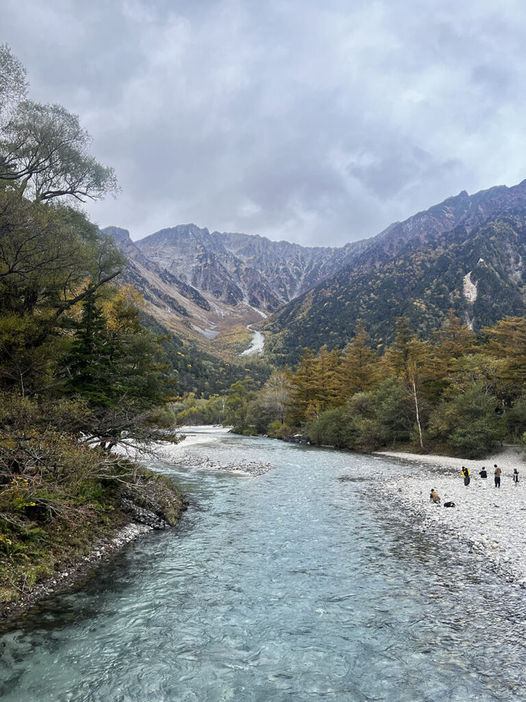 明神へと続く左岸の道を歩き出す。ふと雲が切れ、わずかな陽光が降り注いだ。その瞬間、梓川の流れが鮮やかなエメラルドグリーンに変わった。この透明度はどうだ。それを確認しただけで、足取りが少し軽くなった。