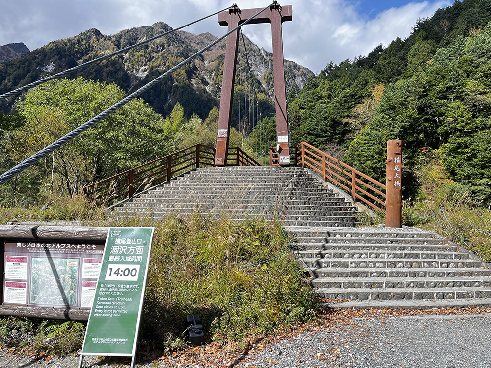 上高地の最深部、横尾に到着。ここから先、横尾大橋を渡れば、いよいよ岩と風の支配する山が始まる。ふと目をやると横尾大橋を渡る前には、見慣れないゲートと掲示板が立っていた。そこには「涸沢方面 最終入域時間 14:00」と記されている。この掲示板は、環境省と北アルプス山小屋友交会などが協力して実施している横尾登山ゲート試行実験。日没後の無理な行動による遭難事故などを防ぐためのものだ。