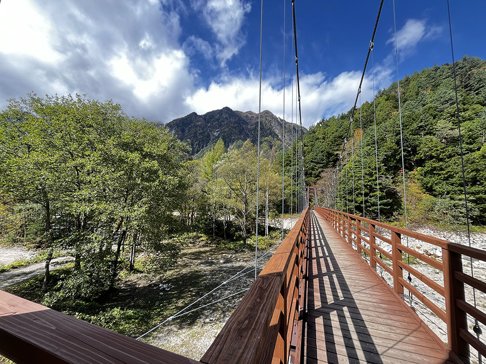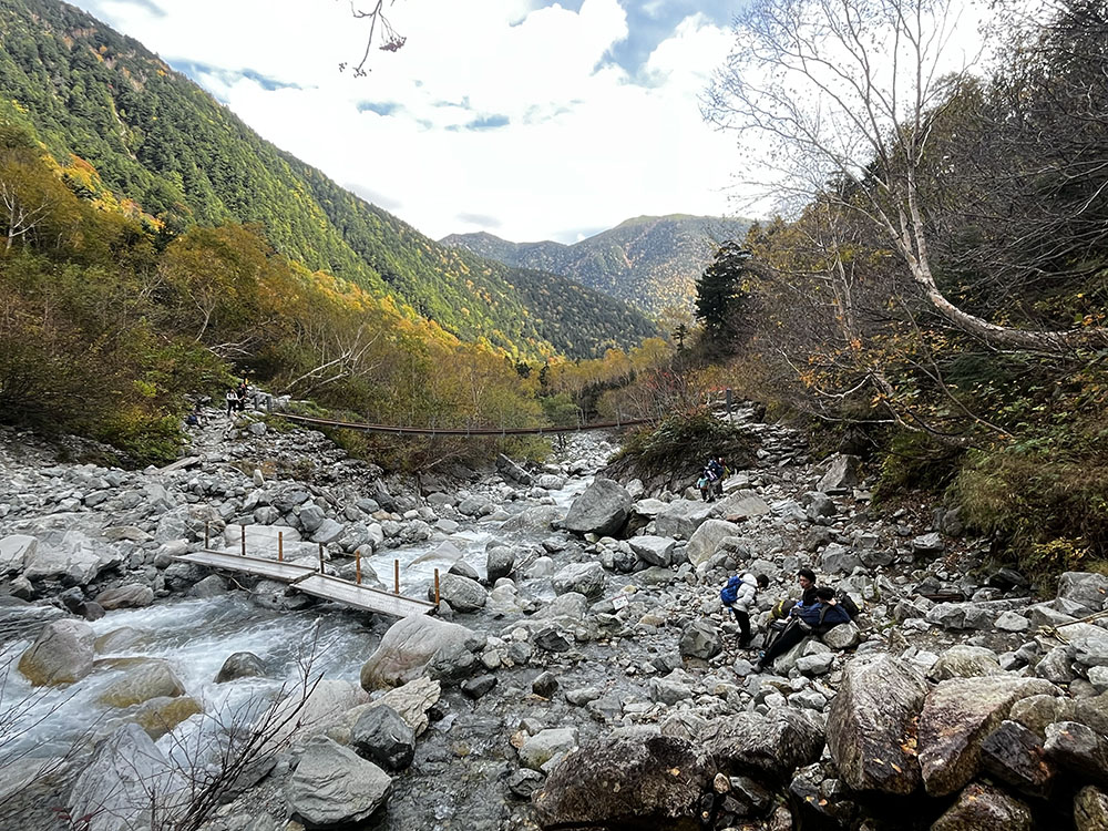 やがて道は梓川の源流沿いとなり、本谷橋(ほんたにばし)に到着した。河原に架けられた木造の吊り橋。一度に渡れる人数に制限がある、少しスリリングな橋。