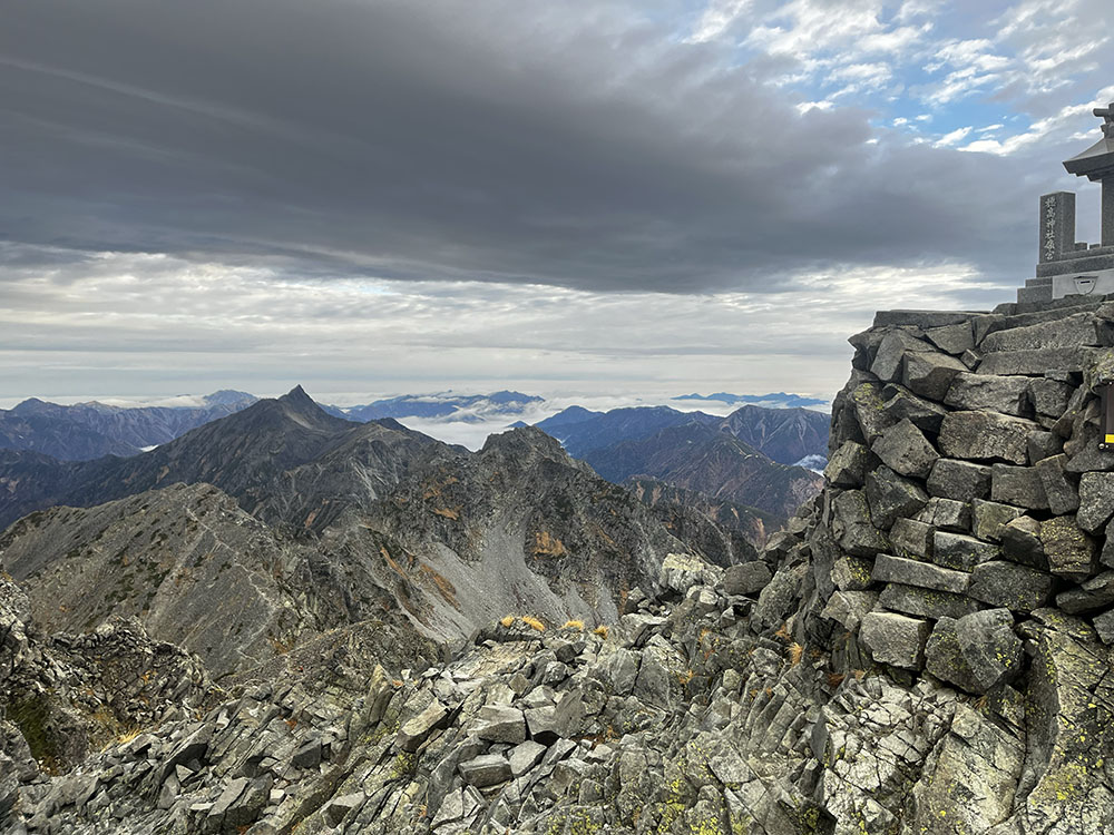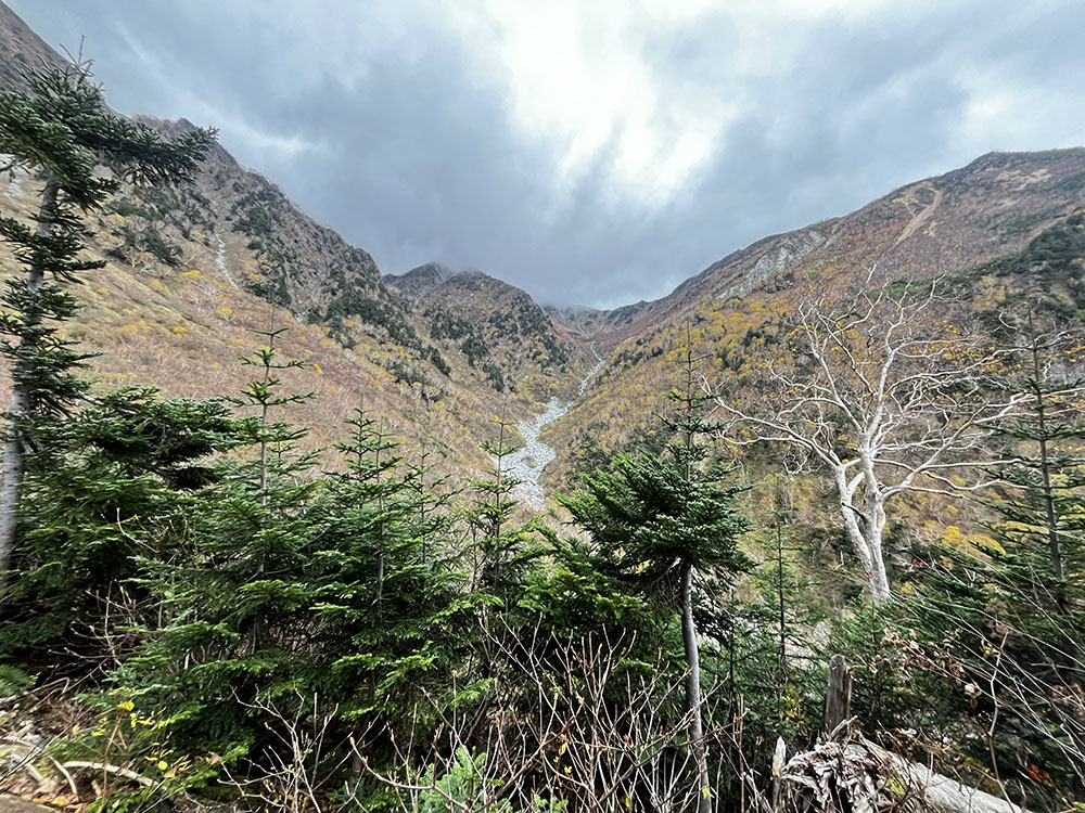 下りは、重力が背中を押してくれる。だが、北アルプスの空は気まぐれだ。あれほど輝いていた青空は、高度を下げるにつれてどこかへ消え去り、灰色の雲がじわじわと山を侵食し始めた。