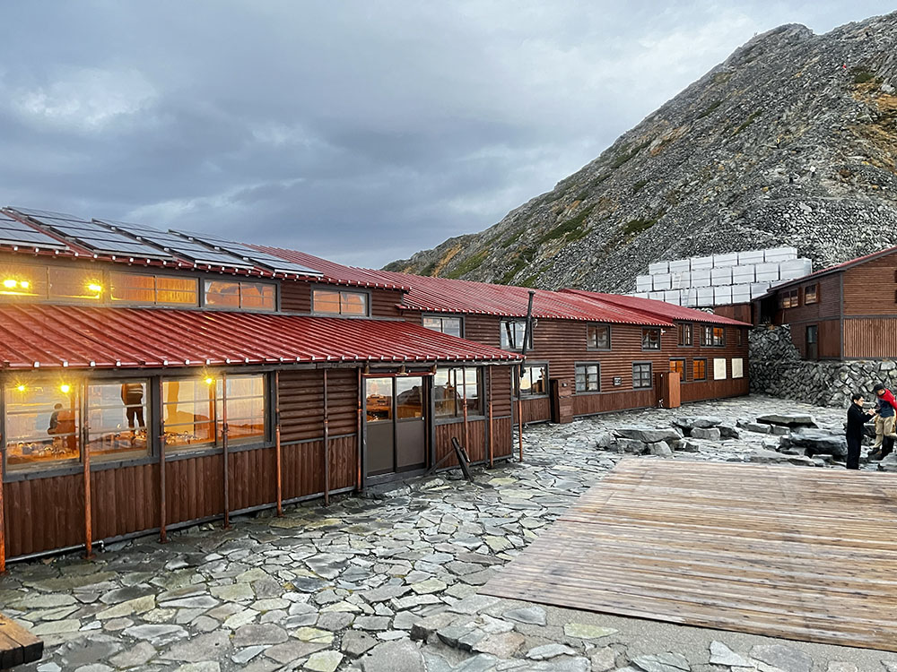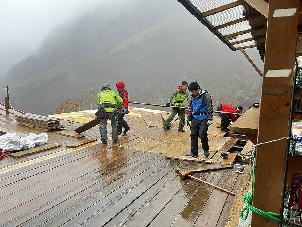 涸沢野営場に到着した。だが、僕がテントの受付を済ませようとしたその時、天候は急変した。 それまで穏やかだった風が牙を剥き、雨が降り出したのだ。標高2,300メートル。気温は一気に下がった。濡れたザックを放り出し、僕はレインウェアを頭まですっぽりと被った。まずは雨風を凌ぐため、涸沢ヒュッテへ。テラスのデッキでは、濡れた木板を新しいものに取り替える補修作業をしていた。山の小屋は、こうして人々の手によって守られている。