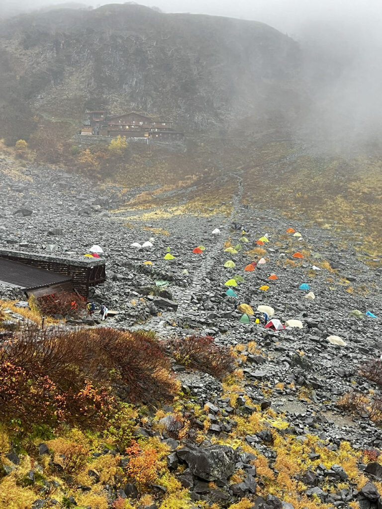 | 13:56 涸沢 | 到着・テント設営 | 突然の雨と冷気。涸沢小屋のモツ煮とお湯割りが、凍えた身体を救ってくれた |
