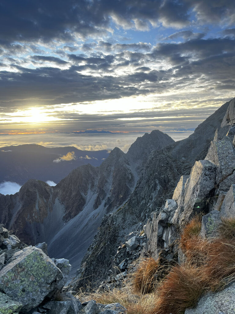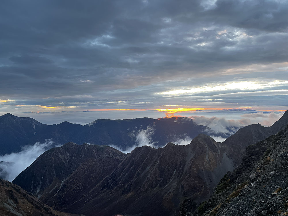 | 05:27 穂高岳山荘 | 稜線到着・日の出待ち | 燃える空、雲海。淹れたてのコーヒーが染み渡る。 |