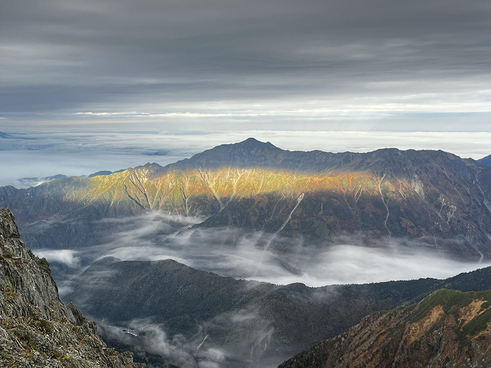 山頂でのひとときを終え、穂高岳山荘へと下り始める。雲の切れ間から、まるで天からの梯子のように光の束が差し込み、荒々しい山肌をスポットライトのように照らし出す。