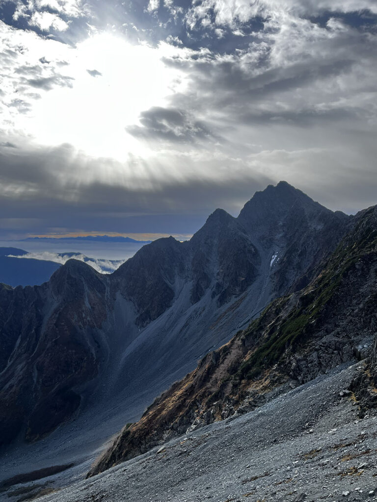 穂高岳山荘から涸沢方面へと、支稜線を慎重に下り始める。標高を下げるにつれ、白い雲が太陽によって切り裂かれ始めた。ふと視線を上げれば、雲の切れ間から差し込む光の束が、荒々しい山肌をスポットライトのように照らし出す。