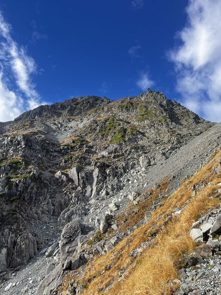 ゴツゴツとした岩が転がる青ガレ。重いザックが肩に食い込み、呼吸が荒くなる。