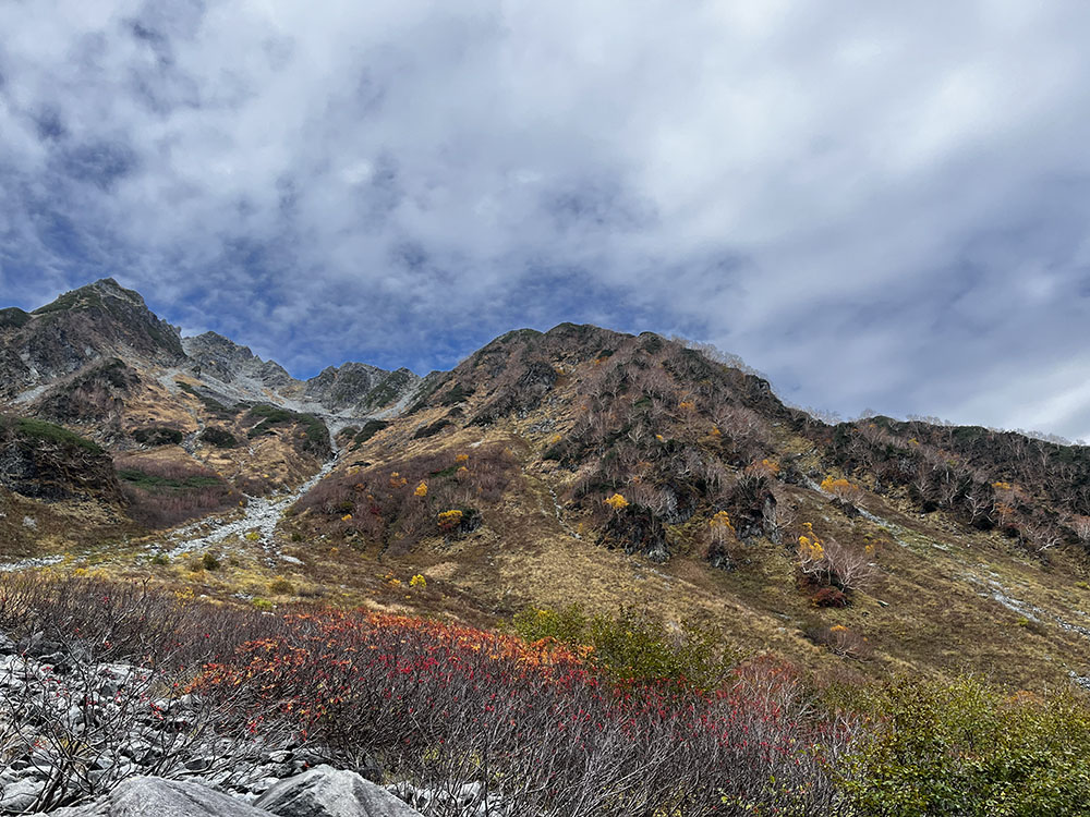 横尾まで戻ってくると、辺りはすっかり厚い雲に覆われていた。