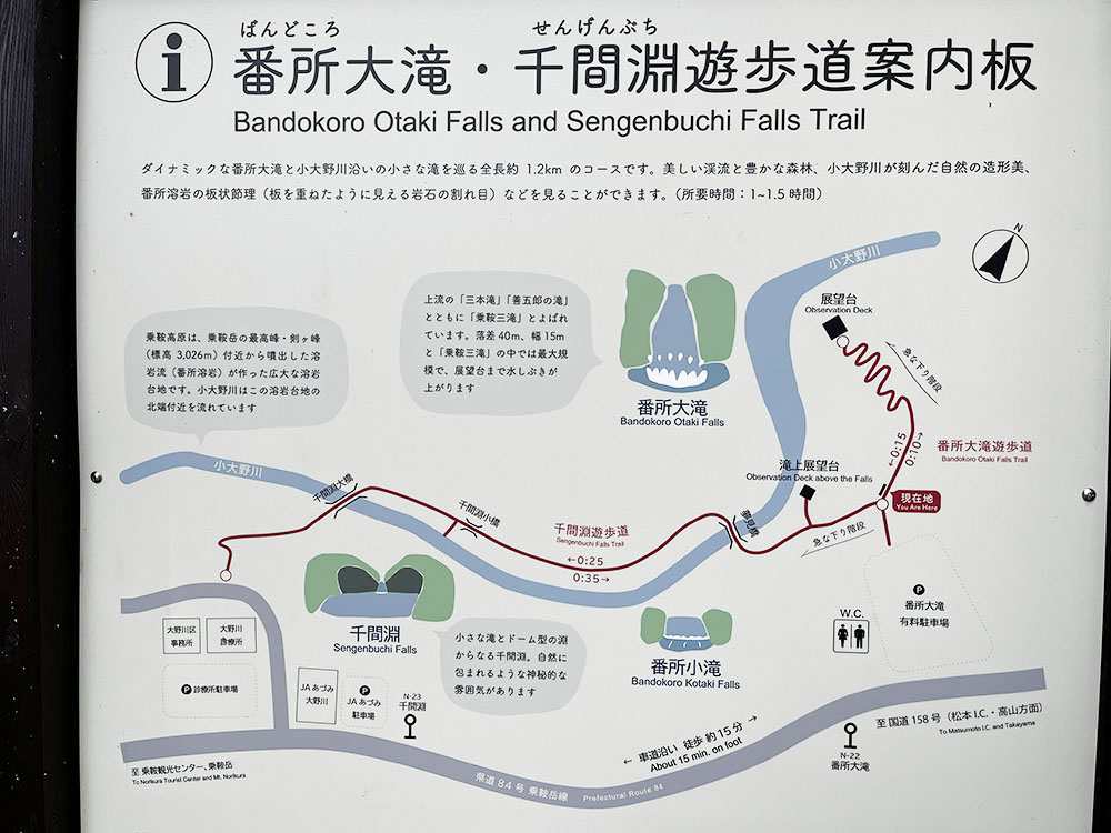 車をとめ、入り口の案内板眺める。番所大滝と千間淵(せんげんぶち)へと続く道の二つの分岐点。