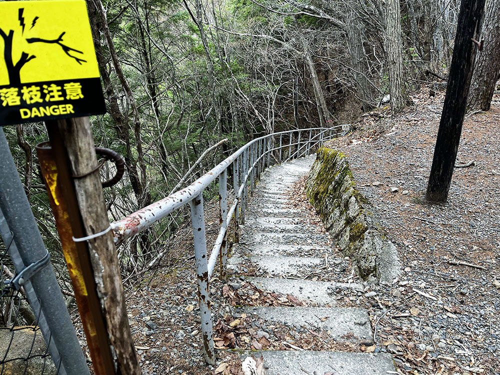 日陰の階段には「落枝注意」の黄色い警告が、そして冬季は封鎖されるこの坂を一歩一歩、靴の裏で感触を確かめながら、慎重に下る。