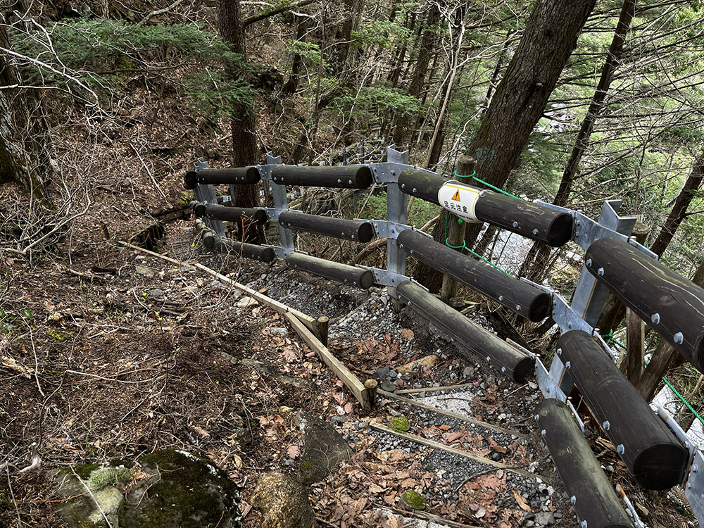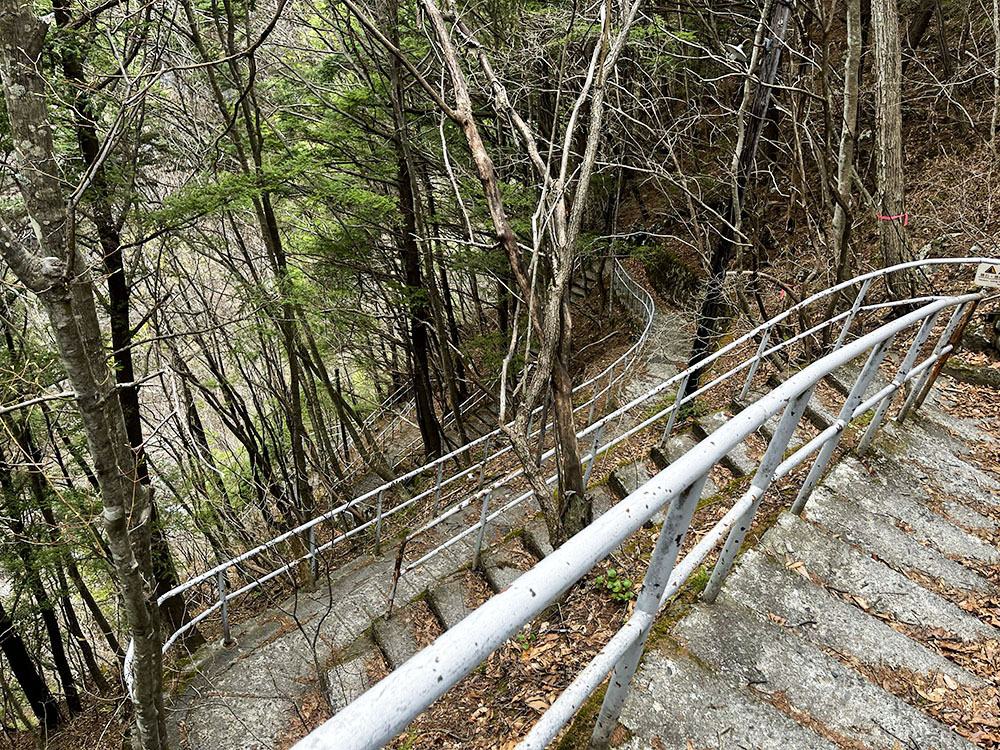 散策道はすぐに急な階段に変わり、谷底へと続いている。