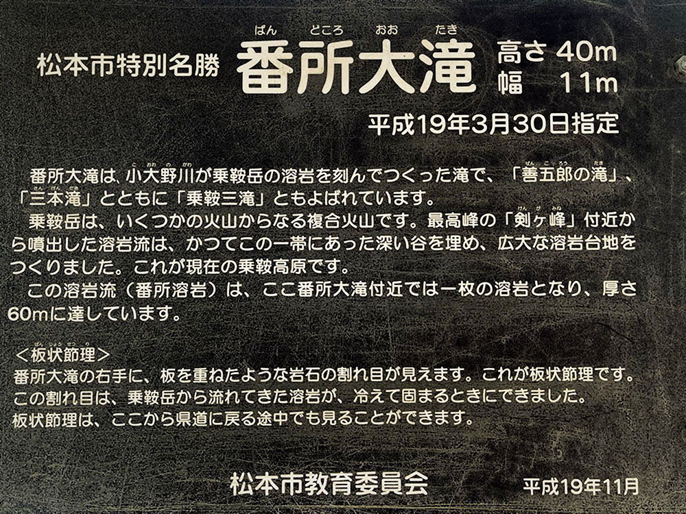 「善五郎の滝」、「三本滝(さんぼんだき)」とともに「乗鞍三滝」の一つである、番所大滝は落差40メートル、幅11メートルというダイナミックなスケールを誇る。