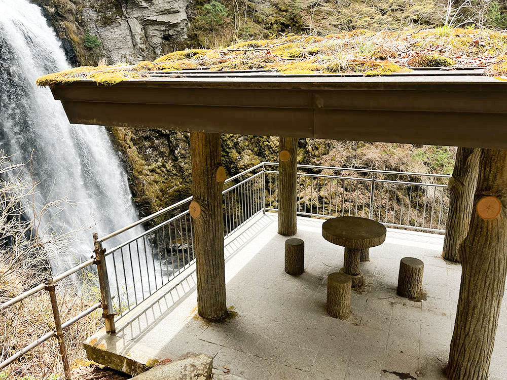 東屋のテーブルと椅子に腰を下ろす。曇り空は、水の音をより深く響かせる。目の前の番所大滝。水量は豪快、凄まじいの一言だ。耳を打つのは、ただひたすらに重厚な水の咆哮。