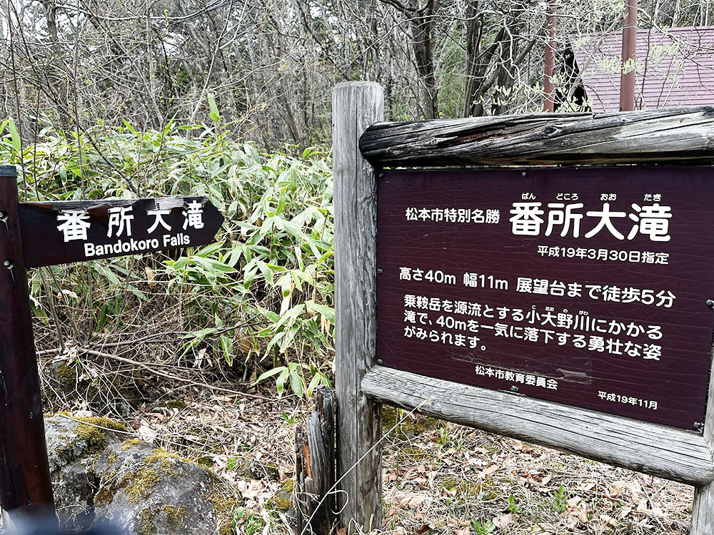 駐車場の入り口には、松本市特別名勝「番所大滝」の立派な看板があり、駐車場の一角には小屋風のトイレがある。車はざっと10台程度は止めらる。駐車料金は小型200円、大型500円。