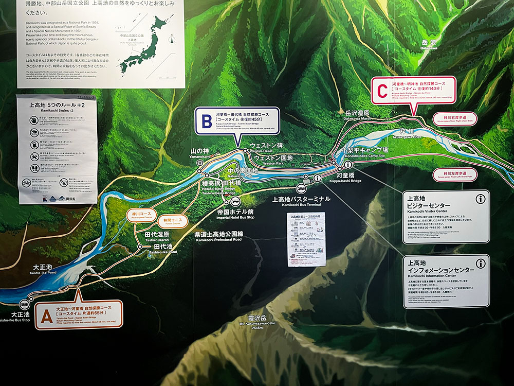 ターミナル内のインフォメーションセンターには、上高地の詳細なウォークガイドが掲示されていた。今日のルートを再確認する。