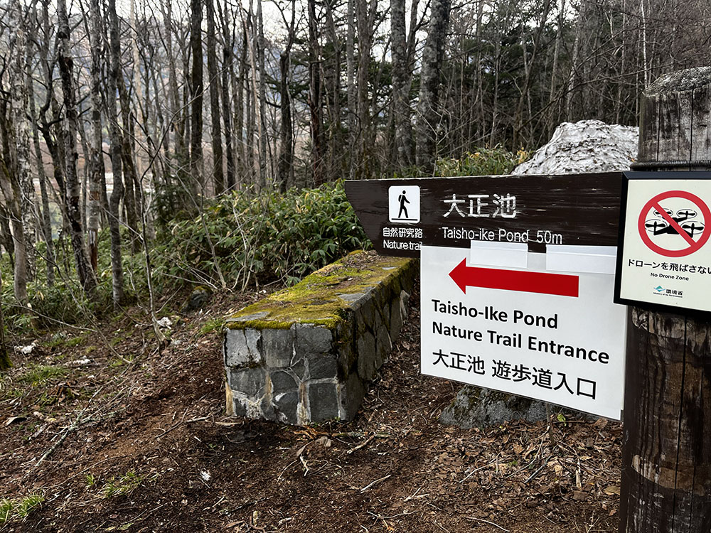沢渡からバスに揺られること約30分。「大正池」の停留所で下車し、遊歩道の入口から池のほとりへと坂を下っていく。