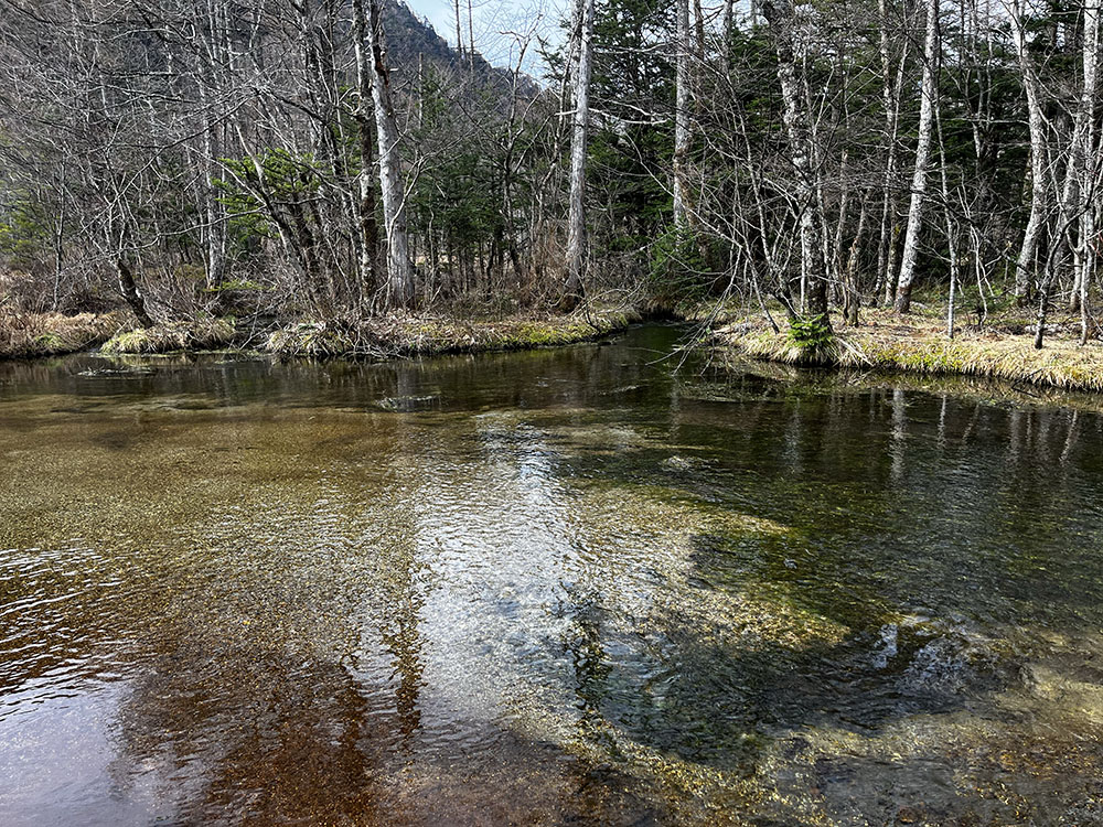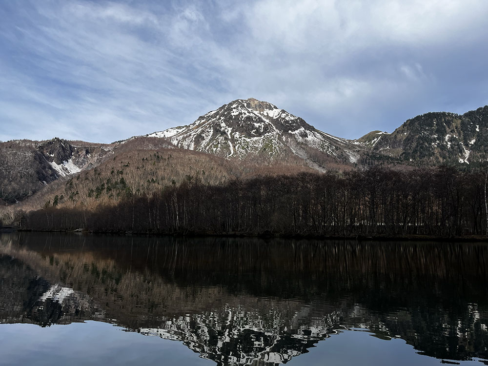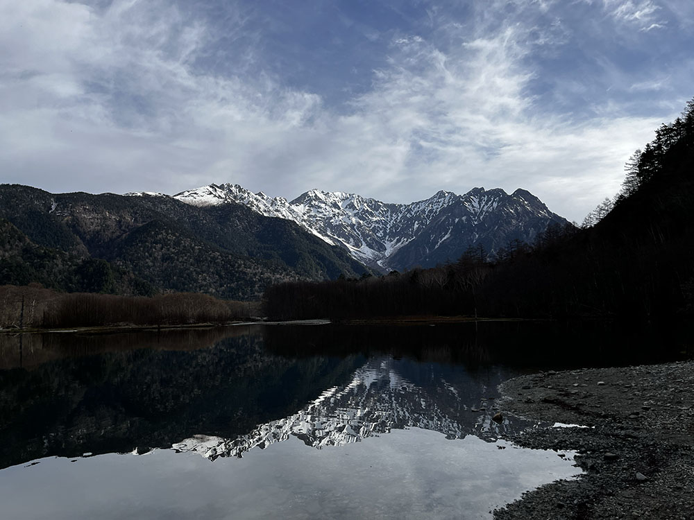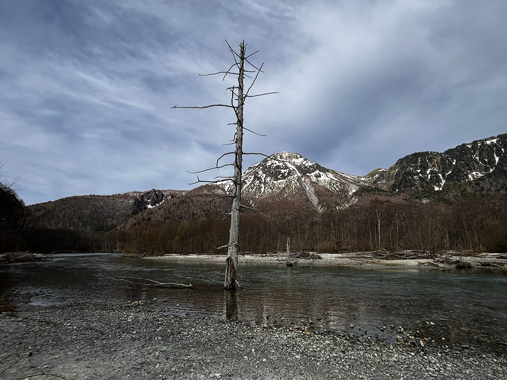 視線を北へ向ければ、そこには圧倒的なスケールの穂高連峰が横たわっている。4月後半のこの時期、山々はまだ深い残雪に覆われ、まばゆいばかりの白さを放っている。空の青と雪の白、そしてそれらを上下反転させて映し出す水面。立ち枯れの木々がその景色のなかに垂直なアクセントを加え、奥行きのある独特な空間を作り出していた。