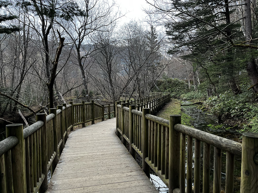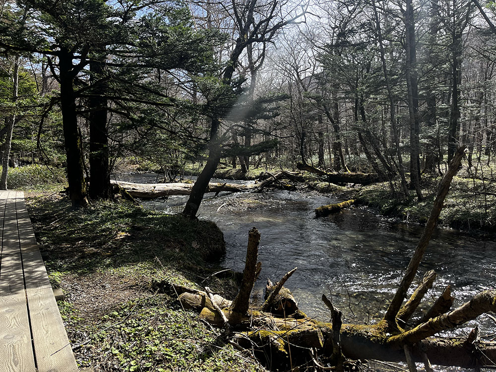 大正池を後にして木道を進み、透明度の高い水が静かに湧き出す田代池へと向かう。