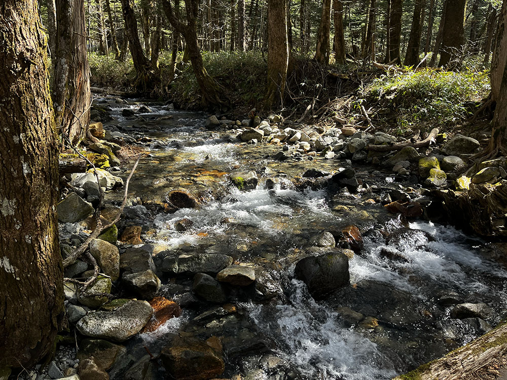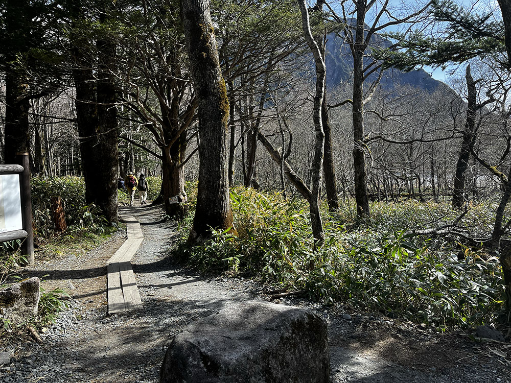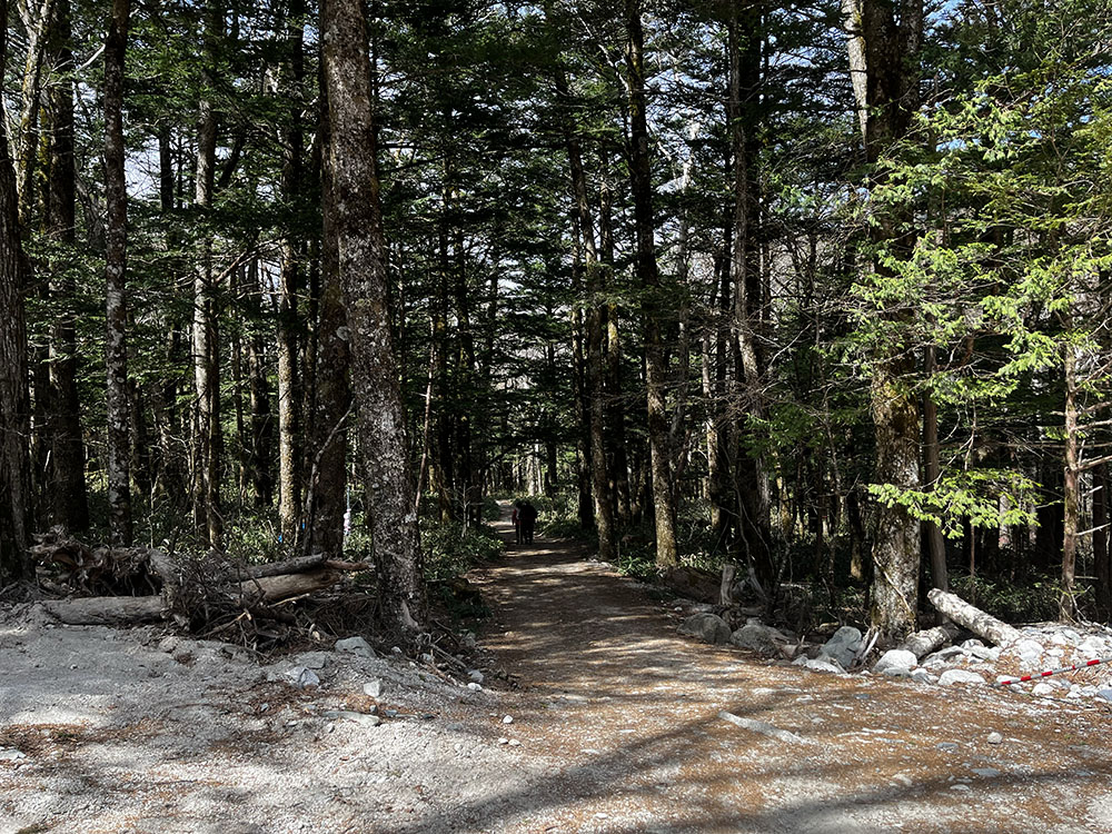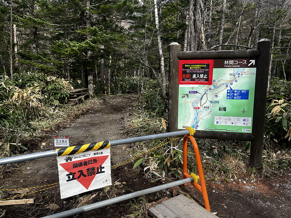 田代池を過ぎると、道は二手に分かれる。本来なら梓川を間近に望む「梓川コース」を歩きたいところだが、現在は歩道の欠損により通行止め。案内に従い、今回は迂回路となる「林間コース」へと足を踏み入れた。