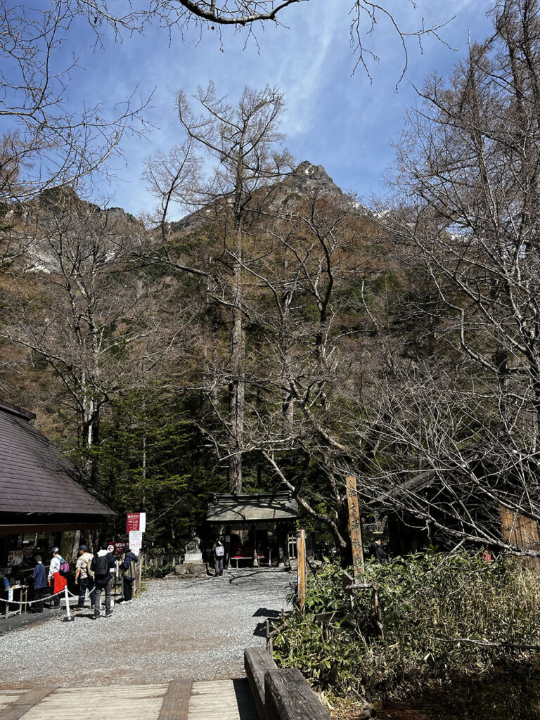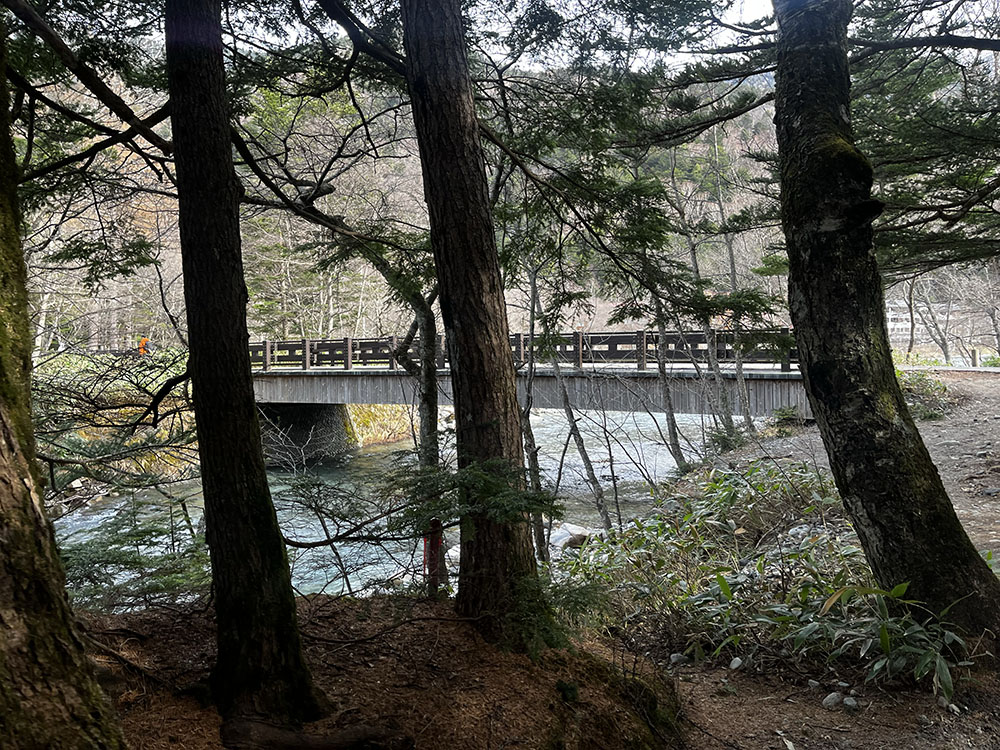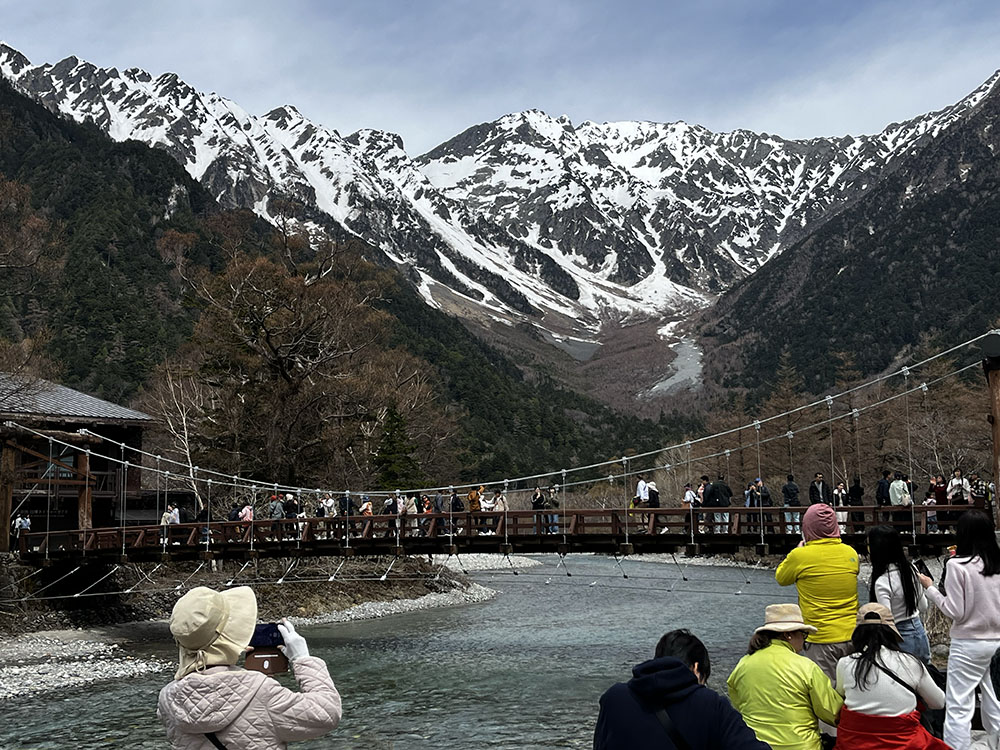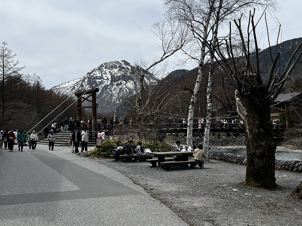 朝8時半に通りかかった時の静けさはどこへやら、橋の上は多くの観光客で溢れかえっている。残雪の穂高をバックに記念撮影をする人々を横目に、僕は足を止めることなく、足早に通り過ぎた。