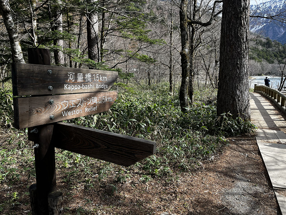橋の袂にある案内板を確認する。ここから先はウェストン碑を経て河童橋へと続く、散策の中盤戦「Bコース」へと入っていく。