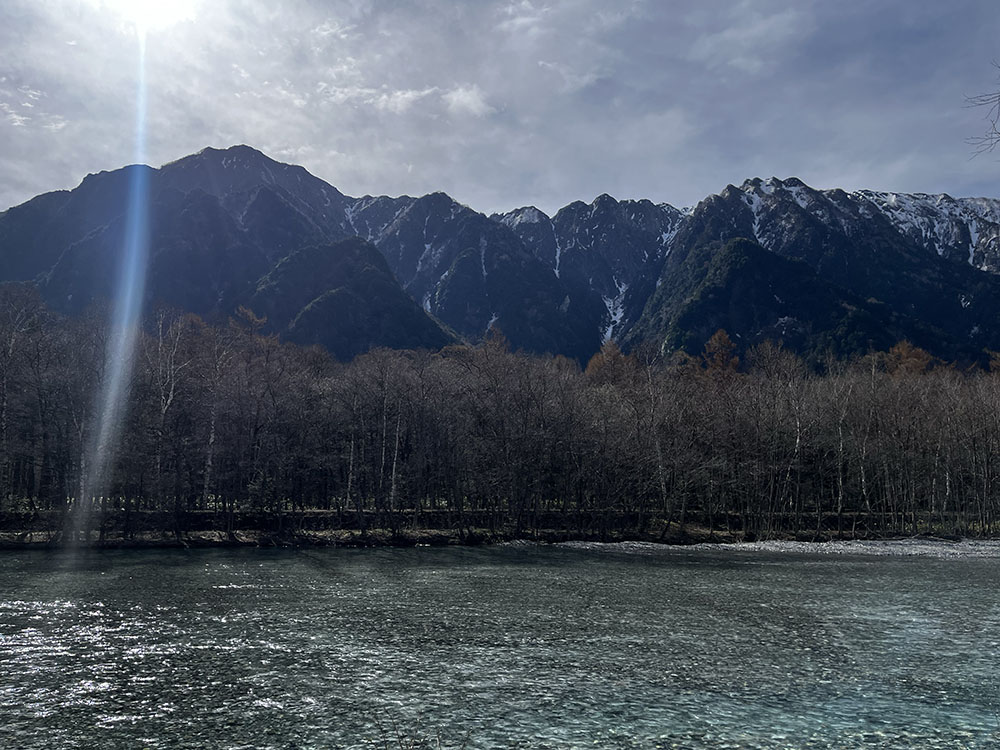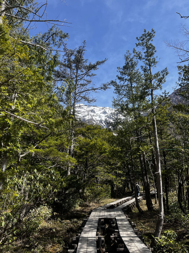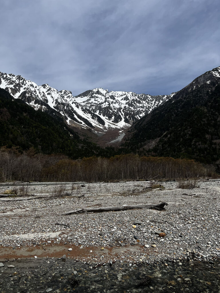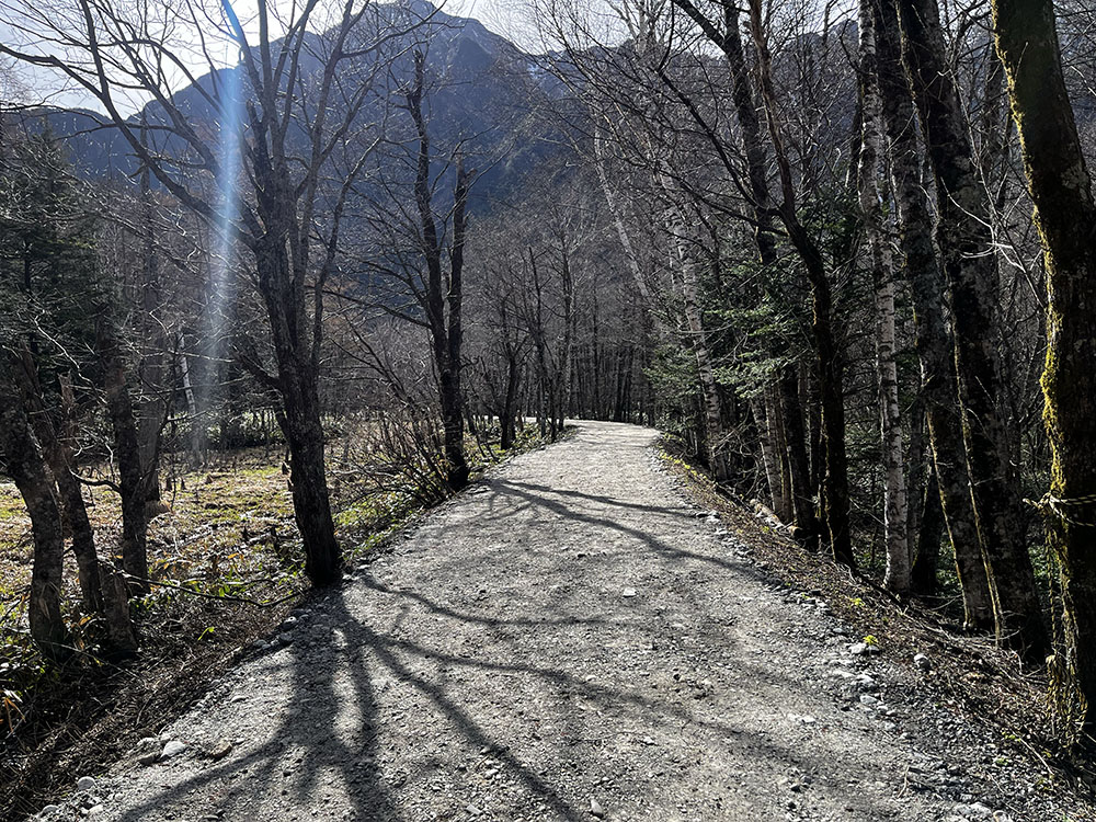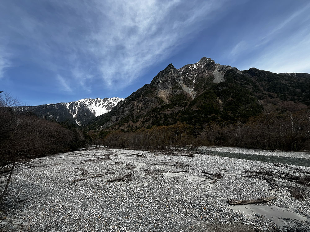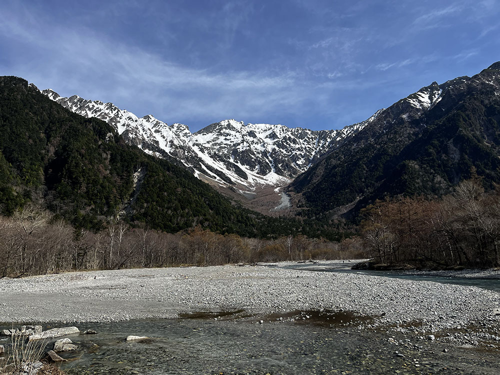 単調になりがちな林道だが、時折、梓川の河原へと視界が開ける場所がある。流木が点在する広い河原の向こうには、真っ白な雪を纏った穂高の連峰が青空を鋭く切り取っており、その雄大さに思わず足を止めて見入ってしまう。