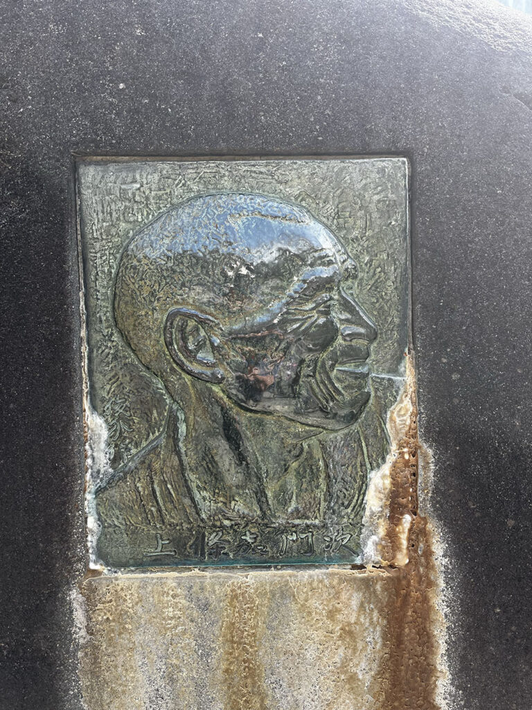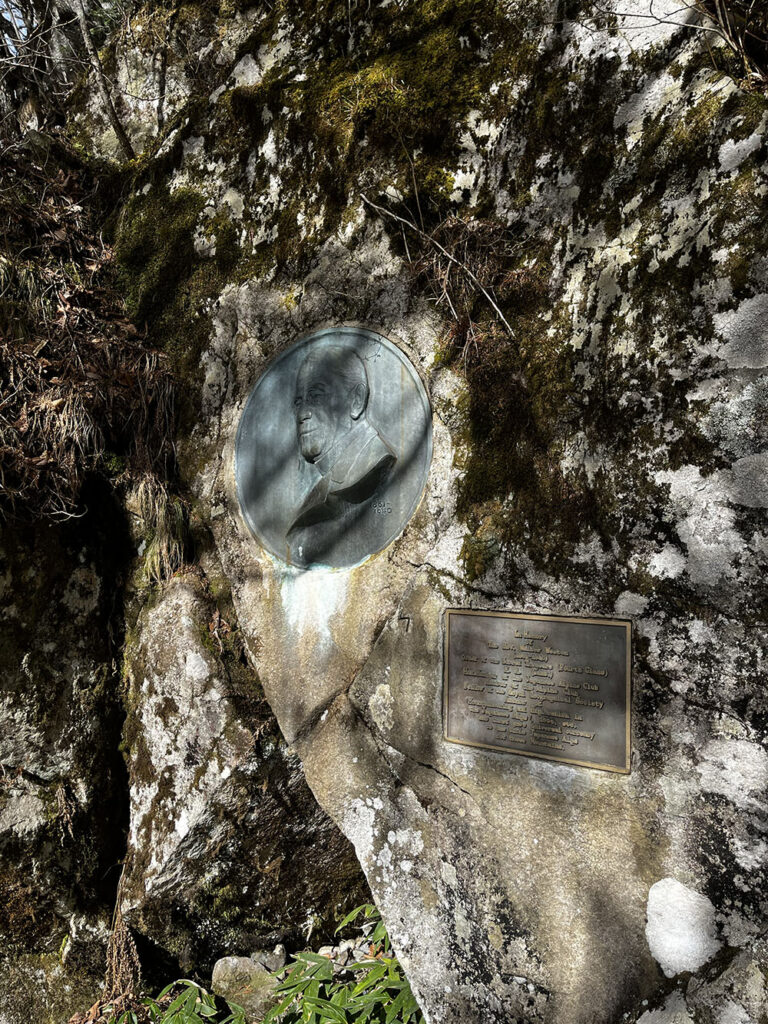 案内標識を確認しながら進むと、ほどなくして岩壁に刻まれたウェストン碑が現れる。日本アルプスの魅力を世界に紹介した英国人宣教師、ウォルター・ウェストンのレリーフ。