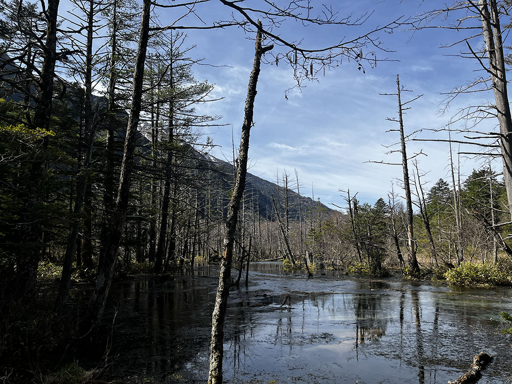 立ち枯れの木々が水面に影を落とす湿原は、静謐さに包まれている。木々の隙間からは、真っ白な雪を纏った穂高連峰が時折その端正な姿を見せ、その美しさに何度も足を止めてしまう。