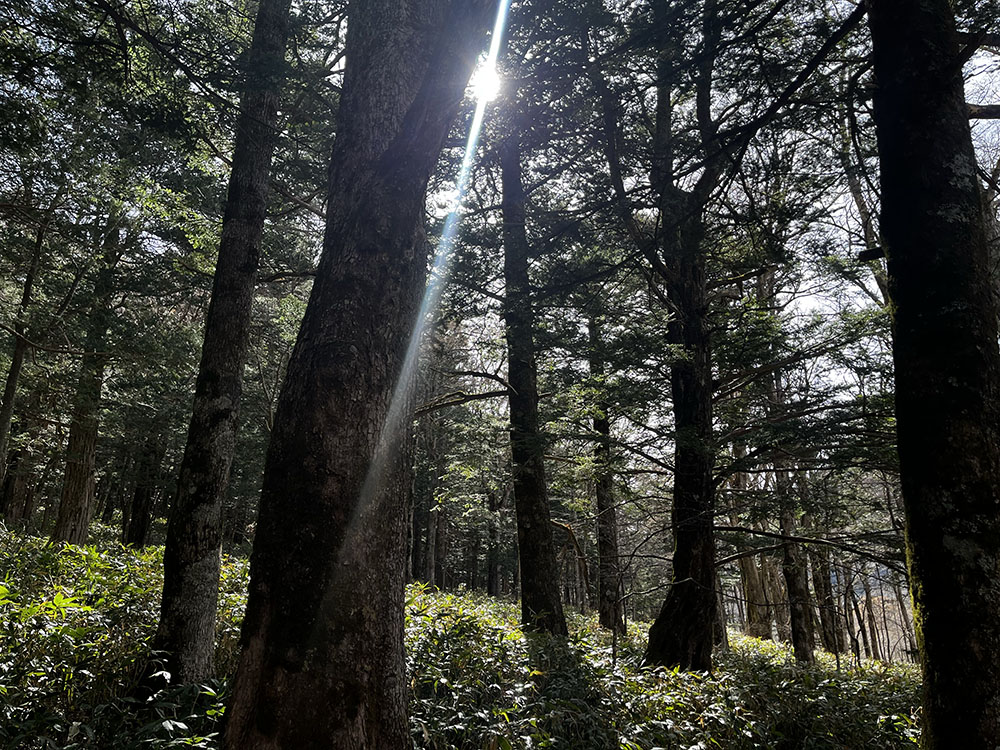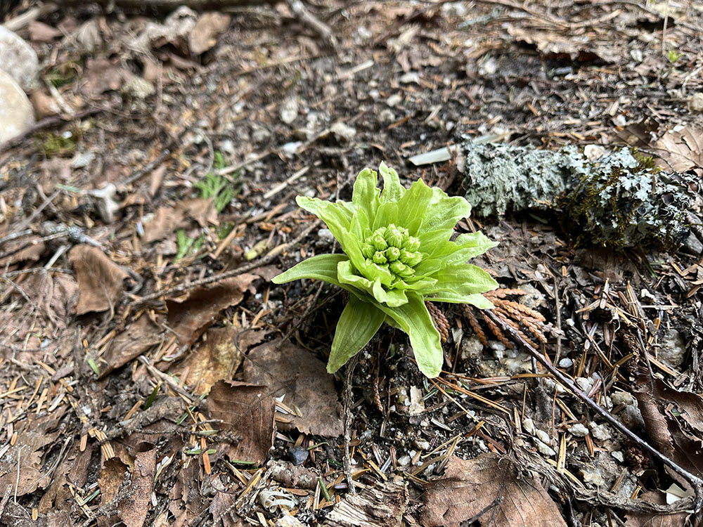 ひんやりとした空気を感じながら足元に目を向けると、雪解け直後の湿った土から、鮮やかな緑色をした蕗のとうが顔を出していた。まだ芽吹いたばかりの瑞々しい姿に、山の確かな春の訪れを感じる。
