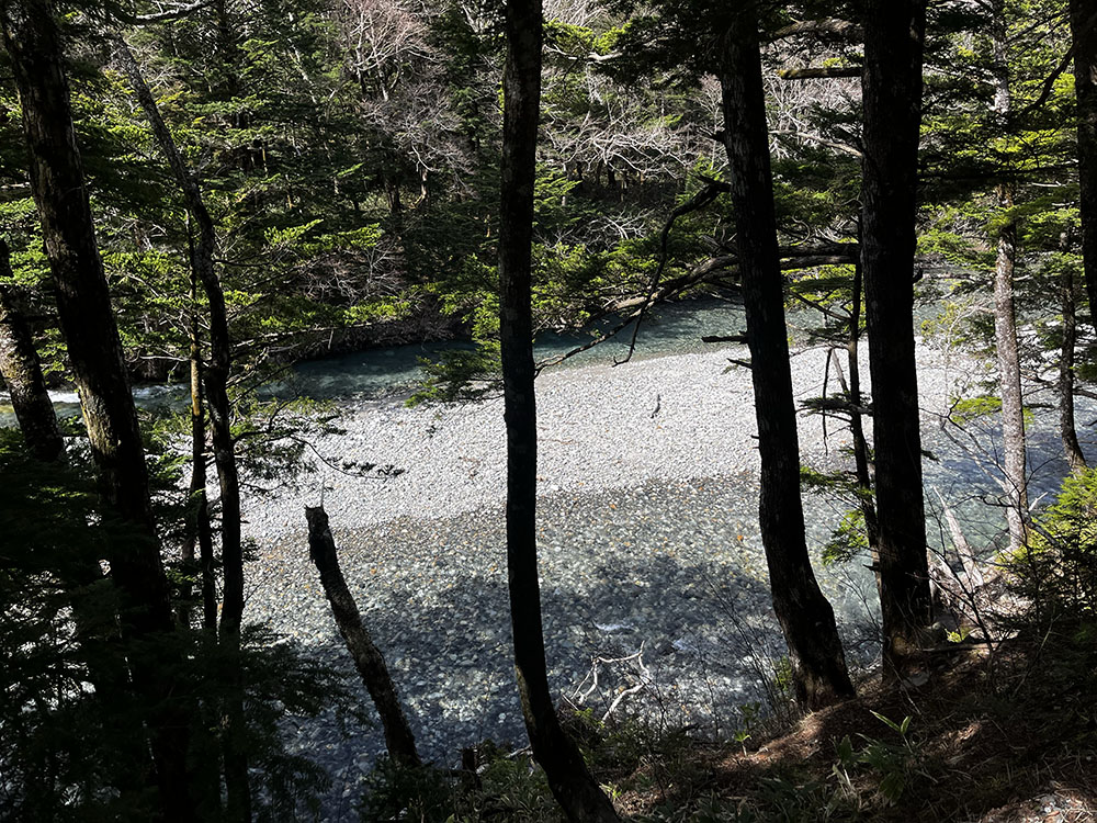 林の間からは、梓川のエメラルドグリーンの水面が時折覗き、その鮮やかな色彩に目を奪われる。