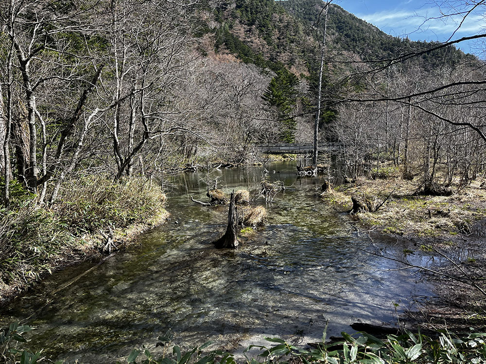 大正池から40分。林間コースを進むと、梓川に架かる「穂高橋」が見えてきた。