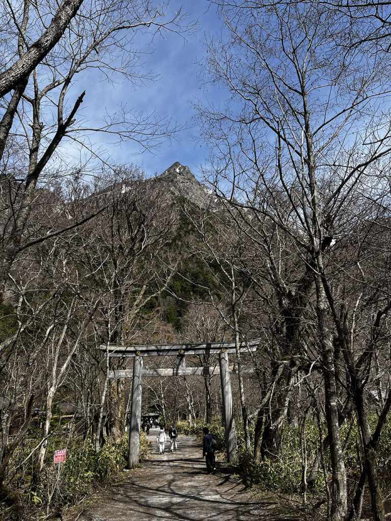 奥宮での参拝を終え、再び参道を戻って明神橋へと向かう。吊り橋の上からは、エメラルドグリーンに澄んだ梓川の流れと、先ほどよりさらに近くに感じる明神岳の岩肌が一望できる。この橋を渡ると、帰路となる梓川左岸のルートに入る。
