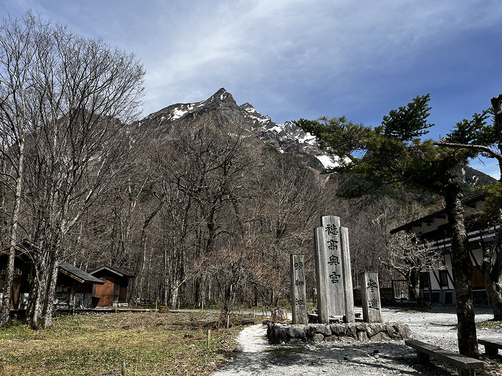 穂高神社奥宮の鳥居をくぐり、神域へと足を踏み入れる。参道の先には、上高地の歴史を語る上で欠かせない嘉門次小屋(かもんじごや)が佇んでいる。