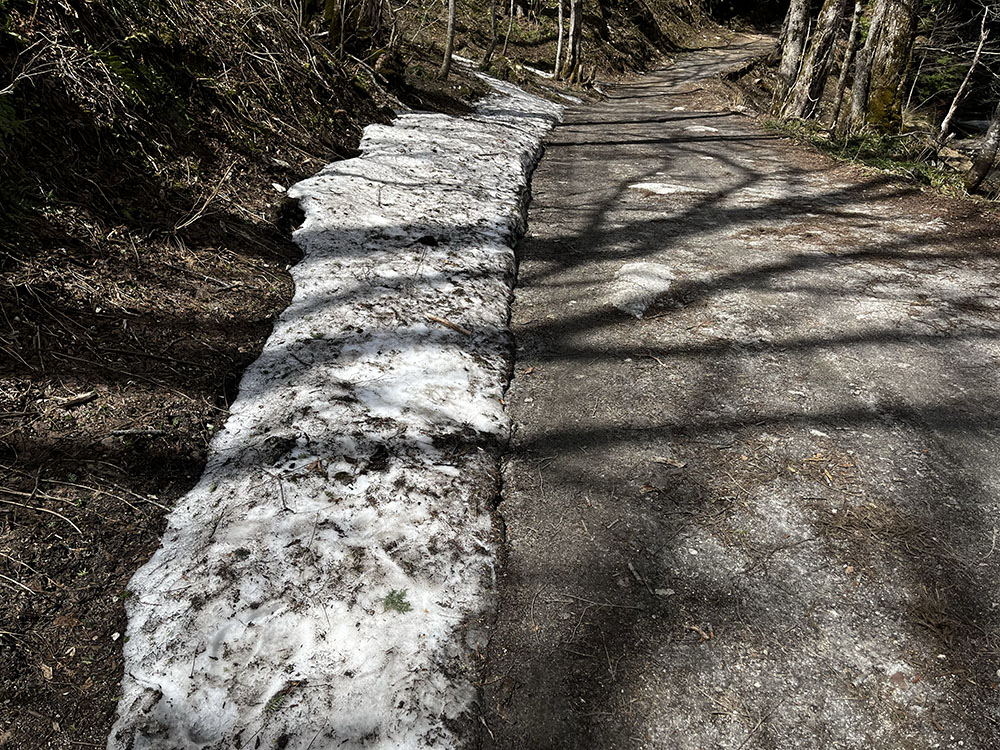 4月下旬、標高1,500mを超えるこの地には、まだ冬の名残がある。日陰になる場所には、道残雪が残っていた。