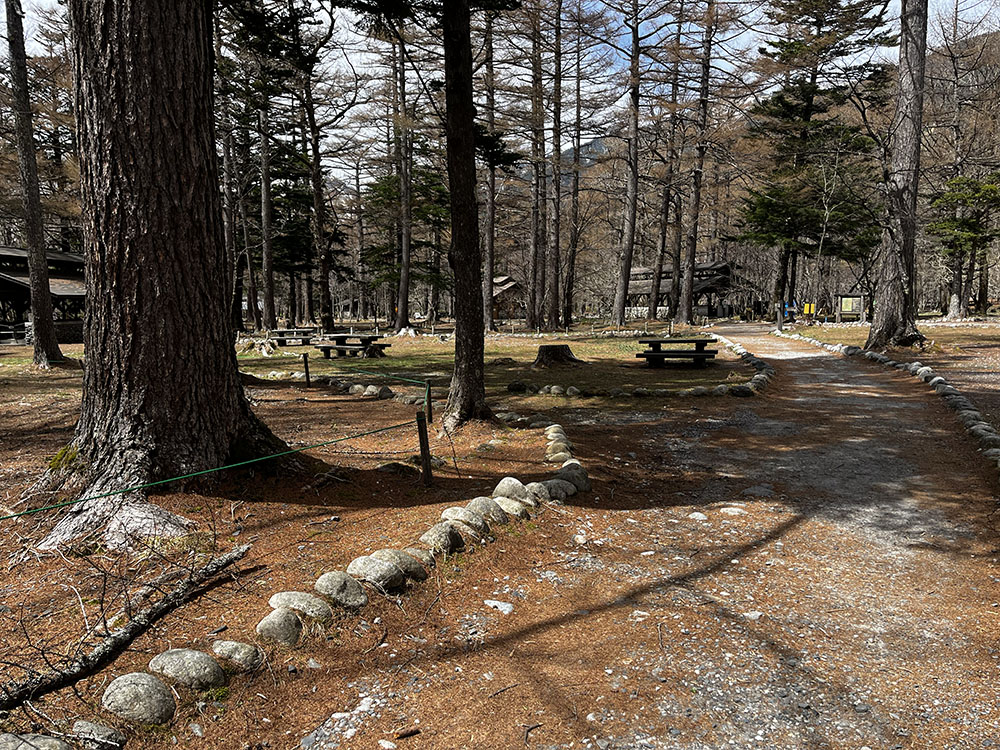 やがて、カラマツ林に囲まれた広々としたエリア、小梨平(こなしだいら)キャンプ場に到着した。