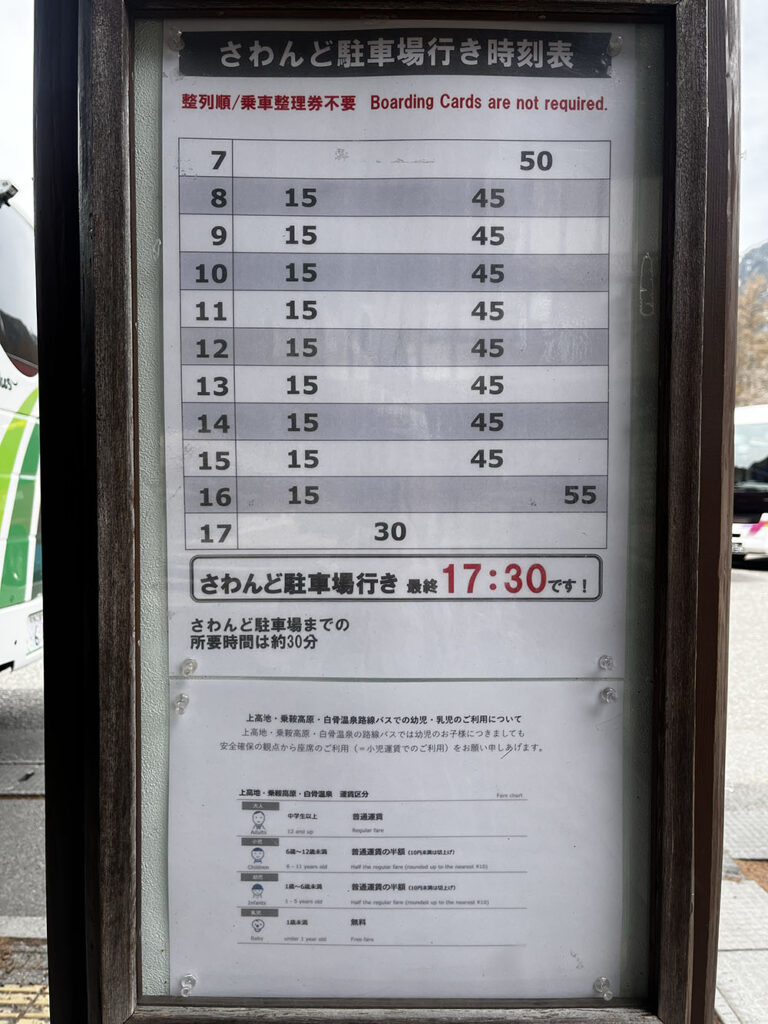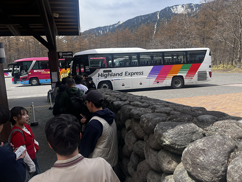 帰りのバス乗り場には、すでに列ができていた。皆、充実した表情でバスを待っている。30分おきに来るバスに乗り込み、車を停めた沢渡へと戻る。