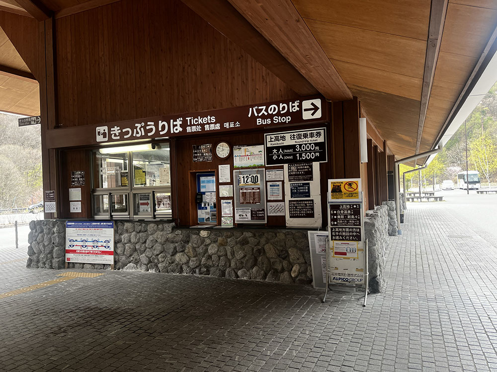 バスターミナルは広々としており、施設も新しく整っている。まずは切符売り場で乗車券を購入。上高地までの往復運賃は大人3,000円。券売機ではクレジットカードも利用できるので便利だ。バスは30分おきに出ている。